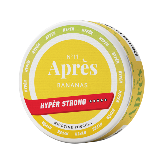 APRÈS Bananas Hypèr Strong är en tobaksfri nikotinpåse med smak av banan. Portionerna är helvita och framtagna i Slim-format för en diskret passform under läppen. Varje påse innehåller 11 mg nikotin, vilket motsvarar 20 mg/g, och klassas som en mycket stark nikotinstyrka. Produkten tillhör kategorin vitt snus.