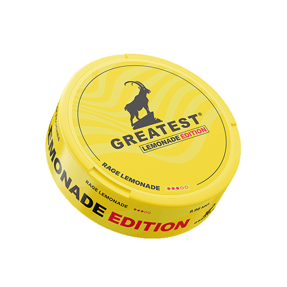 GREATEST Lemonade Edition är en tobaksfri nikotinpåse med kall lemonadkaraktär. Portionerna är designade i slimformat för att placeras diskret under läppen. Varje prilla innehåller 12 mg nikotin, vilket motsvarar 16 mg/g, och nikotinstyrkan klassas som hög. Produkten ingår i kategorin vitt snus.