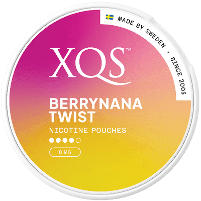 XQS Berrynana Twist Strong är en tobaksfri nikotinpåse som kombinerar bäriga toner med en lätt sötma från banan. Påsarna är helvita och framtagna i slimformat för att ge en diskret passform under läppen. Varje dosa innehåller 20 portioner, och nikotinhalten uppgår till 16 mg/g, vilket gör att produkten klassas som stark. Produkten är en del av XQS-sortimentet och tillhör kategorin vitt snus.